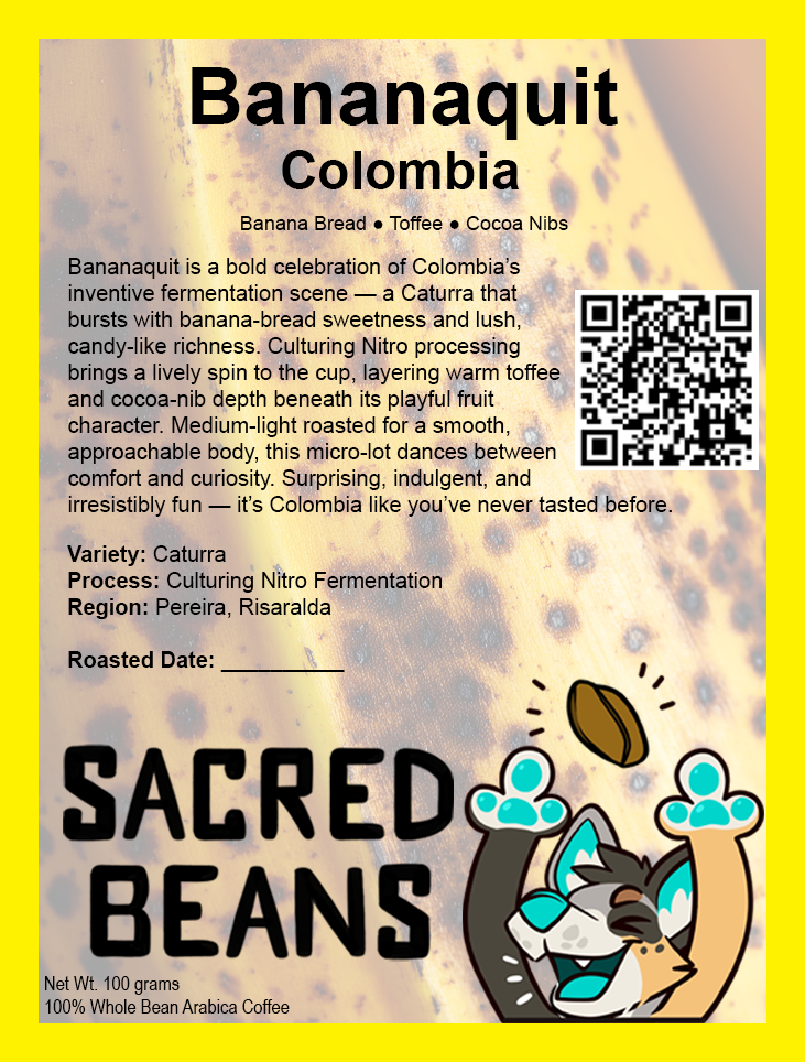 Bananaquit is a vivid and indulgent showcase of Colombia’s innovative fermentation craft. This Caturra comes alive with sweet banana-bread character, layered with rich toffee and cocoa-nib depth. Smooth in body and gently lively in acidity, it offers a comforting yet surprising flavor journey in every sip — playful, aromatic, and undeniably delicious.